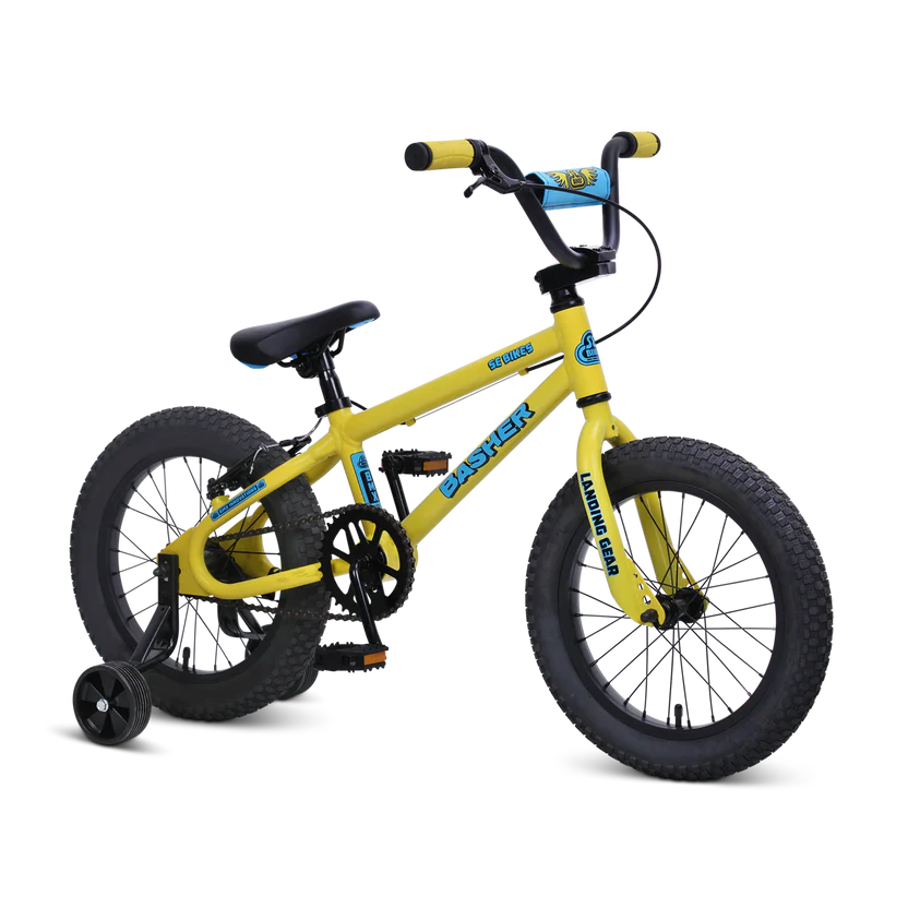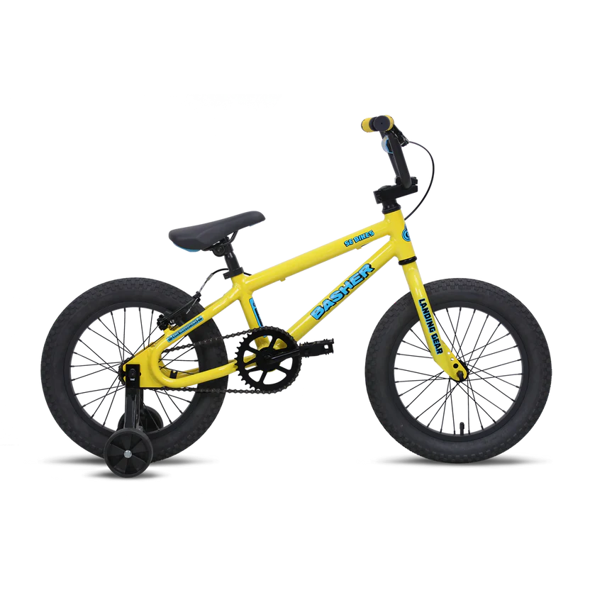 The Basher bike was first introduced to the SE line during the first BMX boom and the brands inception. This legendary bike is making its return this year in multiple new sizes built specifically for kids. The new 16″ Bashers stylish and lightweight frame is built with 6061 aluminum and features a low standover, legendary Looptail rear end, and retro dropouts. The combination of removable training wheels, coaster brake, and hand brake will help new riders build confidence in style when going out on new adventures and riding over their first jumps.